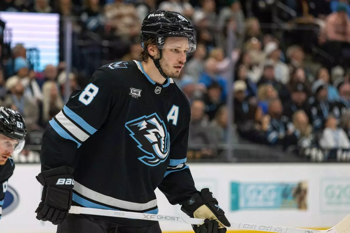 Utah Mammoth defenseman Mikhail Sergachev skates on the ice and is recognized for playing in his 600 NHL game against the Dallas Stars during the second period of an NHL hockey game, Thursday, Jan. 15, 2026, in Salt Lake City. (AP Photo/Melissa Majchrzak)