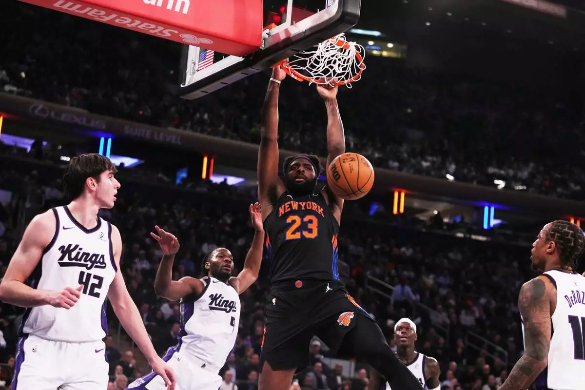 New York Knicks' Mitchell Robinson (23) dunks the ball in front of Sacramento Kings' Maxime Raynaud (42), Precious Achiuwa (9) and DeMar DeRozan during the first half of an NBA basketball game Tuesday, Jan. 27, 2026, in New York. (AP Photo/Frank Franklin II)