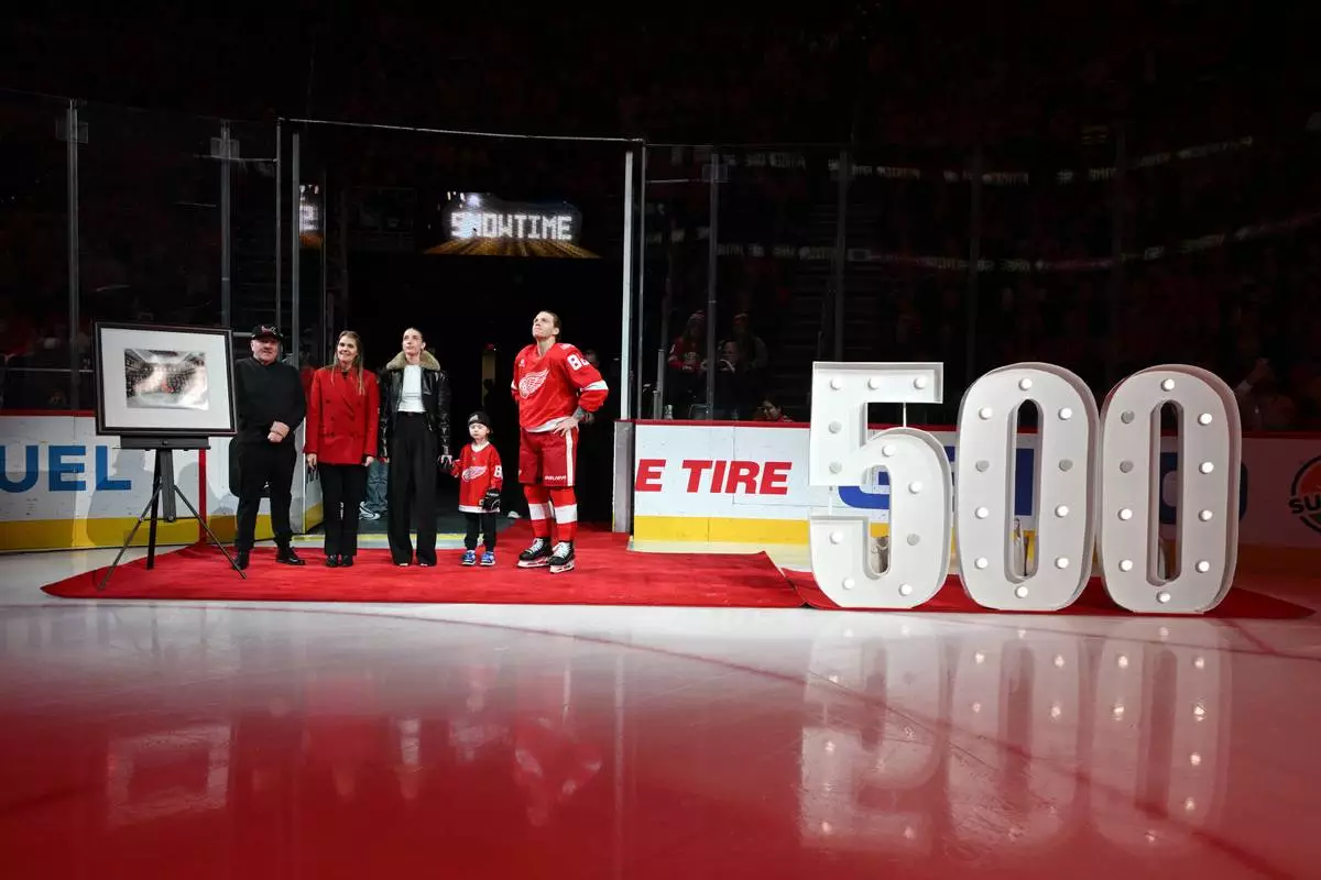 Detroit Red Wings right wing Patrick Kane (88) stands with his family, from left to right, father Patrick Sr., mother Donna, girlfriend Amanda Grahovec, and son Patrick III while being honored by the team for scoring his 500th career goal earlier in the month before an NHL hockey game against the Ottawa Senators, Sunday, Jan. 18, 2026, in Detroit. (AP Photo/Lon Horwedel)
