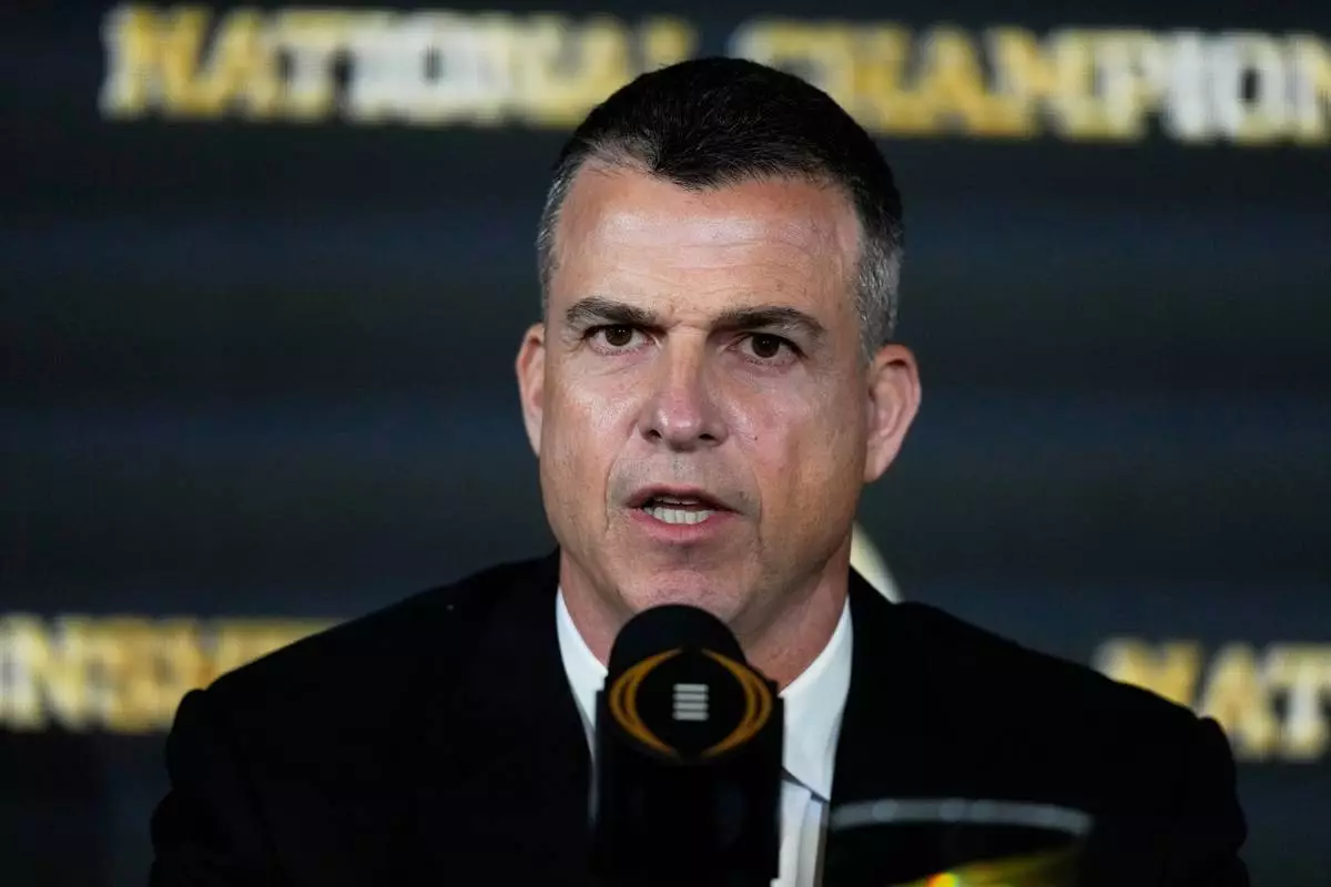 Miami head coach Mario Cristobal speaks during news conference ahead of the College Football Playoff national championship game between Miami and Indiana, Sunday, Jan. 18, 2026, in Miami. The game will be played on Monday. (AP Photo/Chris Carlson)