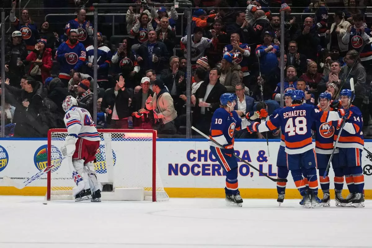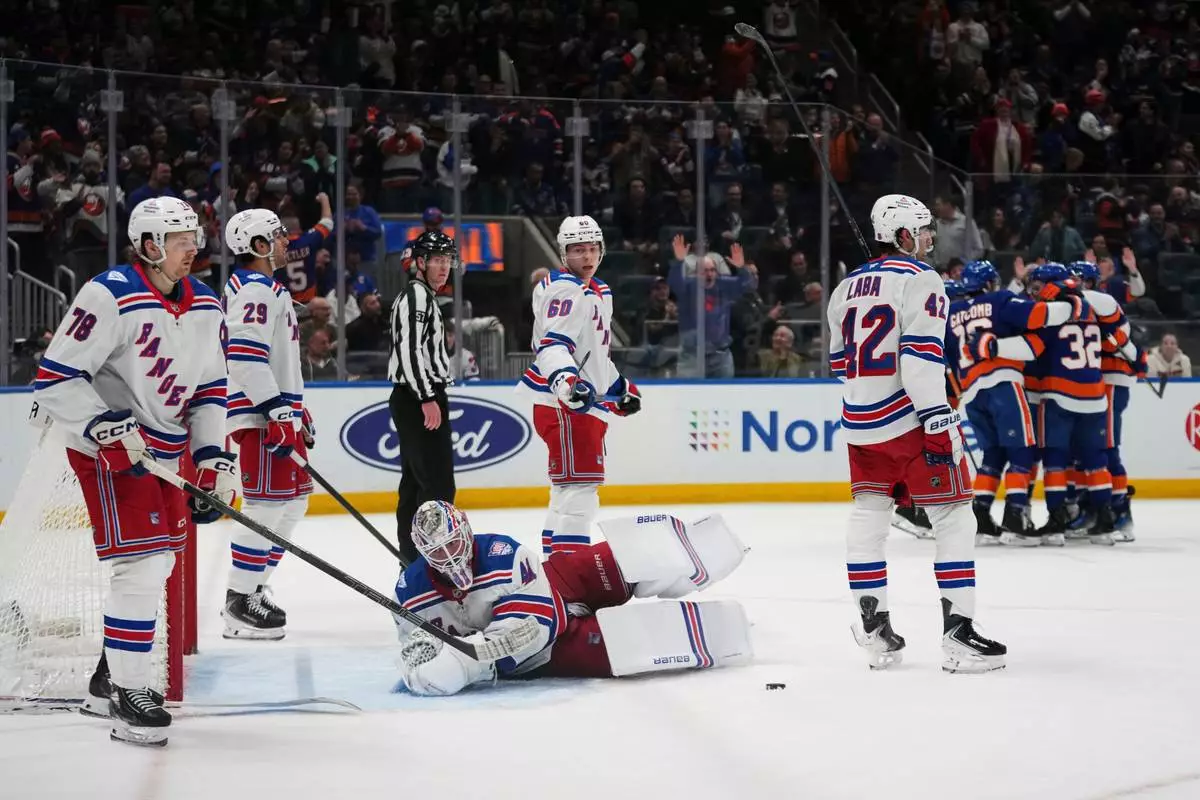 New York Rangers goaltender Spencer Martin (41) skates away as the New York Islanders celebrate a goal by Ondrej Palat during the first period of an NHL hockey game Wednesday, Jan. 28, 2026, in Elmont, N.Y. (AP Photo/Frank Franklin II)