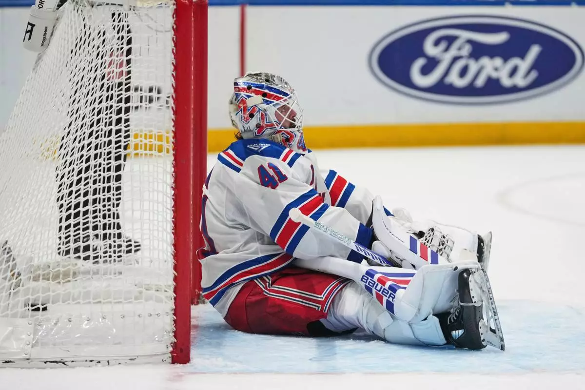 New York Rangers goaltender Spencer Martin (41) reacts after New York Islanders' Mathew Barzal scored a goal during the second period of an NHL hockey game Wednesday, Jan. 28, 2026, in Elmont, N.Y. (AP Photo/Frank Franklin II)
