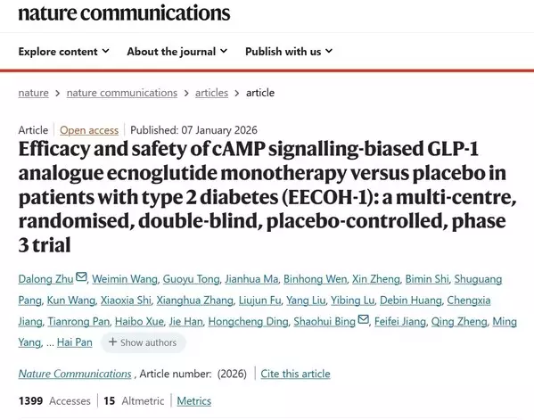 HANGZHOU, China, Jan. 28, 2026 /PRNewswire/ -- Recently, the results of the pivotal Phase III clinical trial (EECOH-1) of ecnoglutide injection, developed by Sciwind Biosciences Co., Ltd. ("Sciwind"), for the monotherapy of type 2 diabetes (T2DM), have been published in Nature Communications. Conducted in adult T2DM patients with inadequate glycemic control after diet and exercise intervention, the results demonstrate that ecnoglutide injection — potentially the world's first long-acting cAMP-biased GLP-1 receptor agonist — significantly lowers blood glucose while also showing comprehensive benefits including weight reduction and improvement of metabolic parameters.