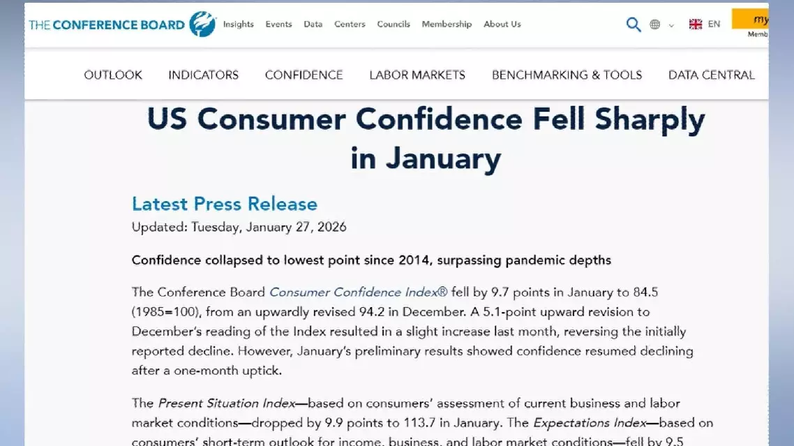 U.S. consumer confidence plunged in January to its lowest level in more than a decade, as U.S. people grew increasingly pessimistic about geopolitical tensions, high prices and the economic impact of trade policies, The Conference Board reported Tuesday.