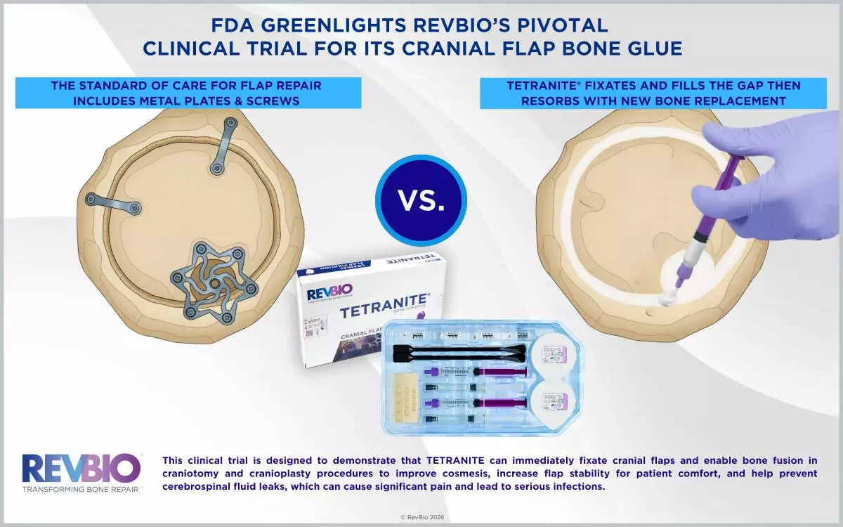 RevBio, Inc., announced that it has received investigational device exemption (IDE) approval from the FDA to conduct a multi-center randomized controlled pivotal clinical trial to use TETRANITE® to reintegrate cranial bone flaps, which are portions of the skull that are temporarily removed by neurosurgeons to perform brain surgery.