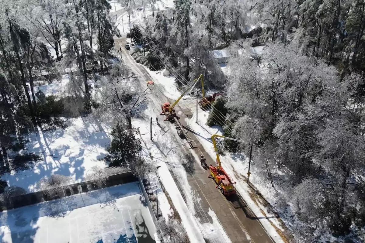 This image taken from a video released by the city of Oxford, Miss., shows crews working on power lines Tuesday, Jan. 27, 2026. (City of Oxford Mississippi via AP)