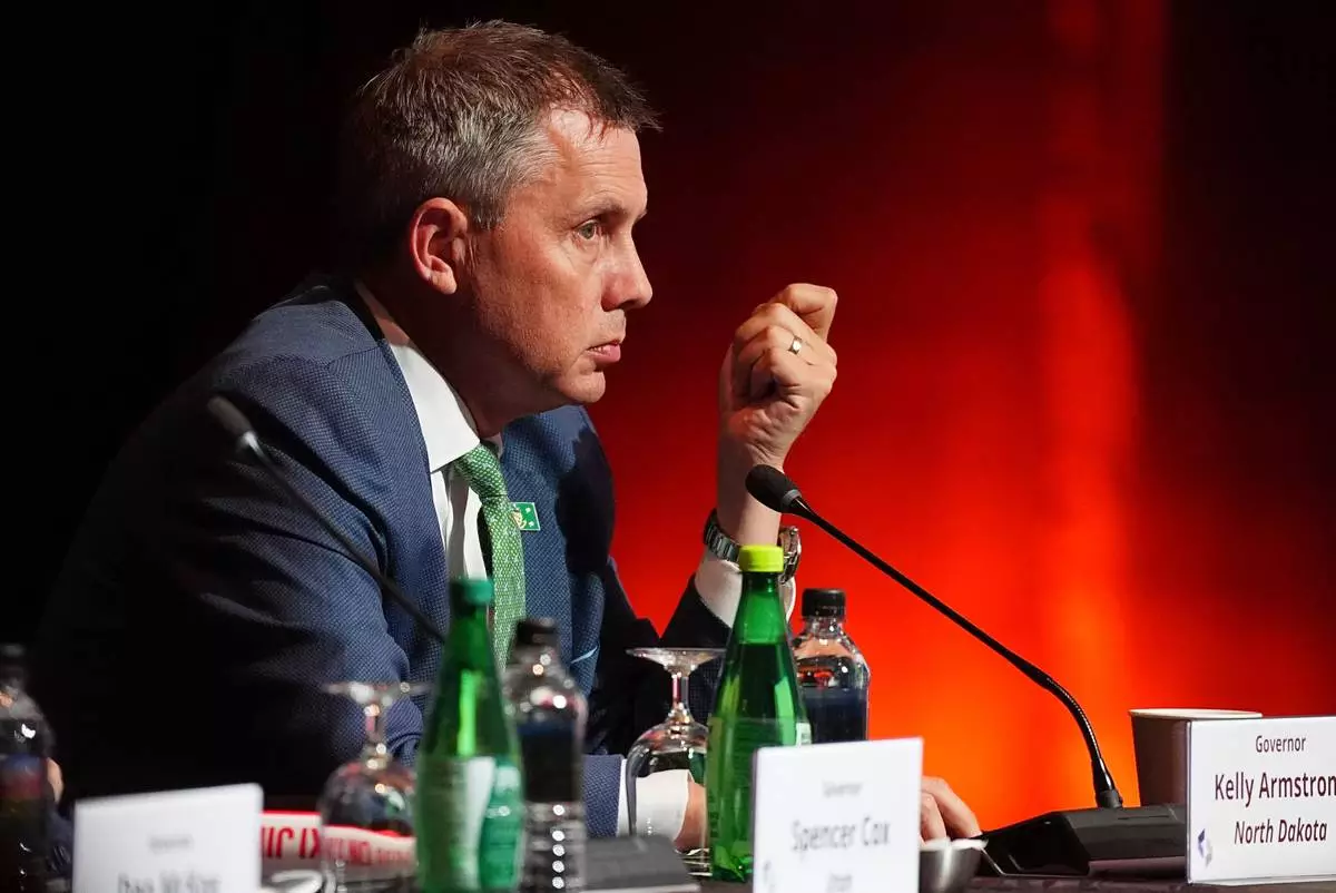 FILE - North Dakota Governor Kelly Armstrong listens to Mark Cuban as he speaks greets during the summer meeting of the National Governors Association at the Broadmoor Hotel in Colorado Springs, Colo., July 25, 2025. (AP Photo/David Zalubowski, File)