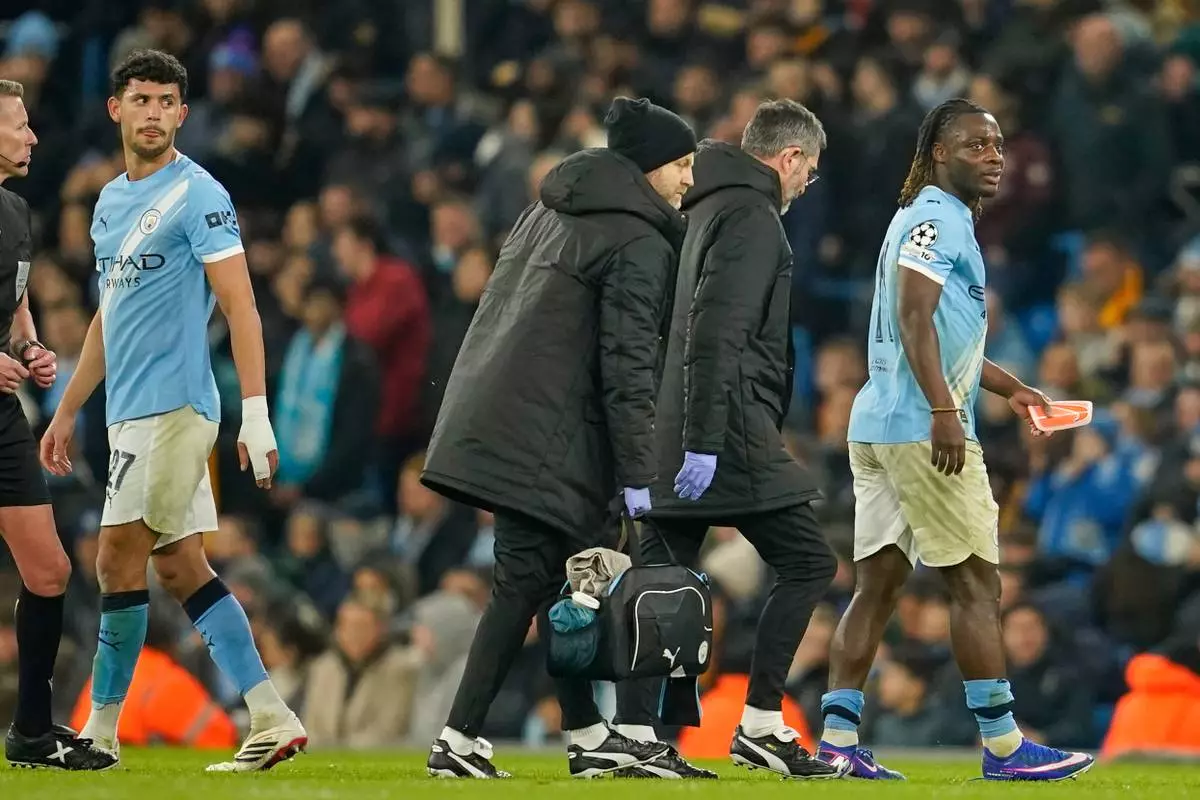 MANCHESTER, England (AP) — Jeremy Doku was injured and forced off before halftime as Manchester City advanced to the last 16 of the Champions League with a 2-0 win over Galatasaray on Wednesday.