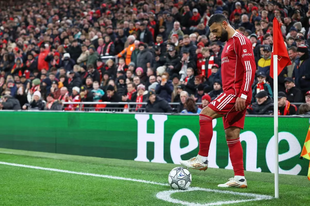 Liverpool's Mohamed Salah prepares to execute a corner kick during the Champions League soccer match between Liverpool and Qarabag in Liverpool, Wednesday, Jan. 28, 2026. (AP Photo/Darren Staples)