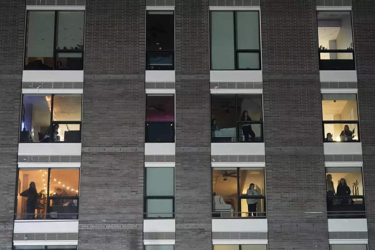 People watch from a building as police prepare to make arrests during a noise demonstration outside the Graduate by Hilton Minneapolis hotel on Wednesday, Jan. 28, 2026, in Minneapolis. (AP Photo/Adam Gray)
