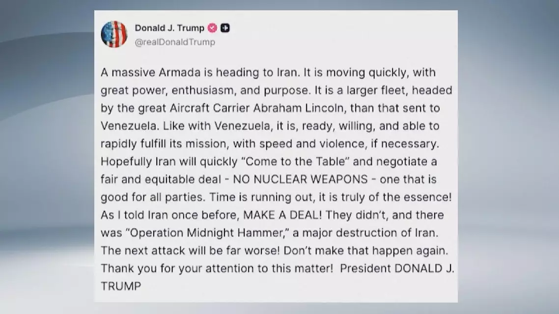 Trump said in a social media post on Wednesday that "a massive armada is heading to Iran" and "moving quickly, with great power", warning Tehran to make a deal or the attack will be far worse than previous military actions.