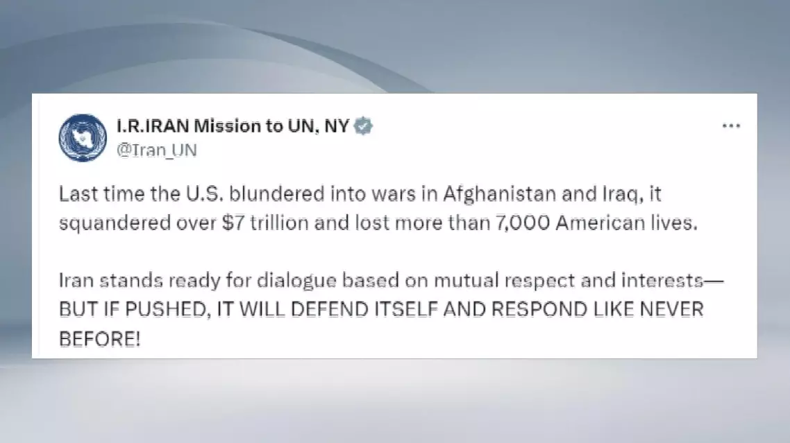"The last time the U.S. blundered into wars in Afghanistan and Iraq, it squandered over 7 trillion U.S. dollars and lost more than 7,000 American lives," the statement said. "Iran stands ready for dialogue based on mutual respect and interests -- but if pushed, it will defend itself," the mission said in a post on social media platform X.