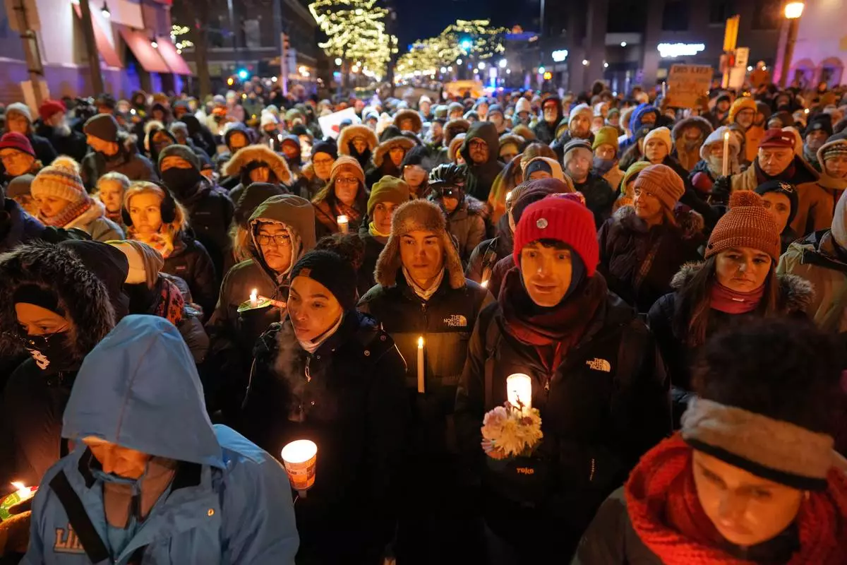 People gather during a vigil where Alex Pretti was shot and killed by federal immigration enforcement in Minneapolis, on Wednesday, Jan. 28, 2026. (AP Photo/Adam Gray)