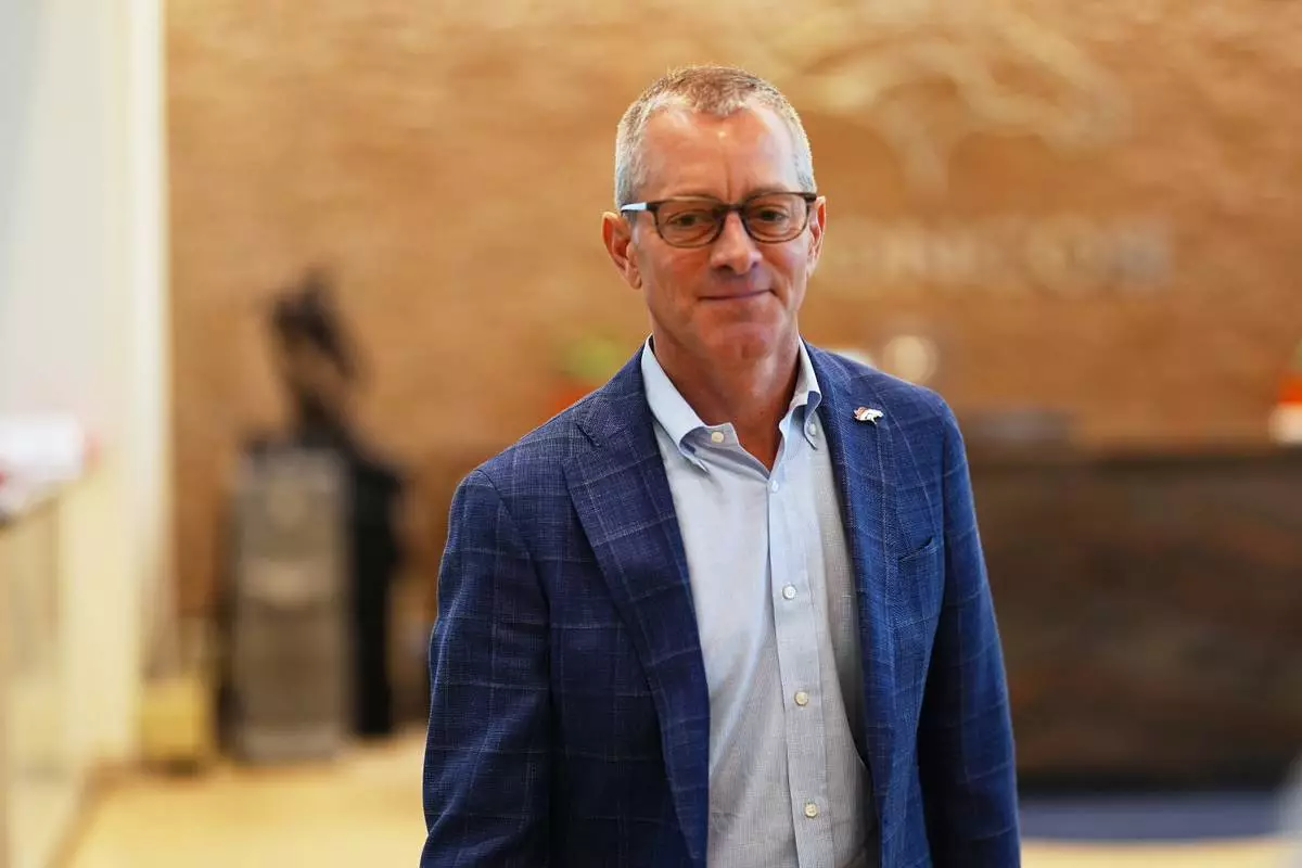 Denver Broncos chief executive officer and co-owner Greg Penner heads into a season-ending news conference Wednesday, Jan. 28, 2026, at the NFL football team's headquarters in Centennial, Colo. (AP Photo/David Zalubowski)