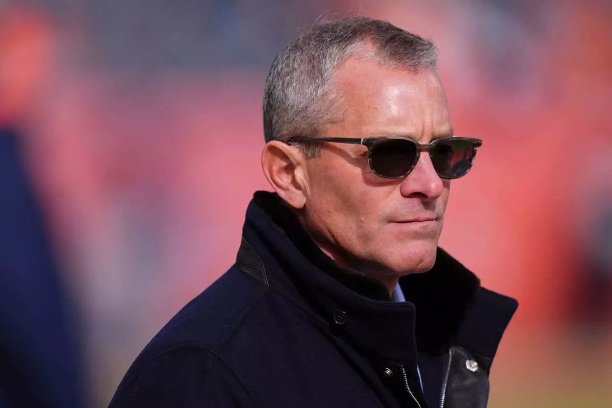 Denver Broncos CEO and owner Greg Penner watches warm ups prior to the AFC Championship NFL football game against the New England Patriots, Sunday, Jan. 25, 2026, in Denver. (AP Photo/David Zalubowski)