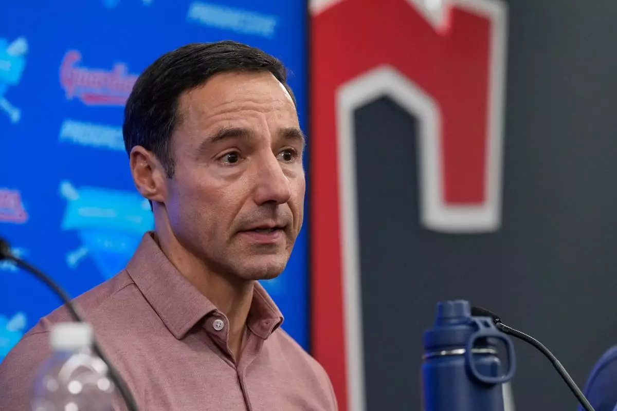 Chris Antonetti, Cleveland Guardians president, baseball operations, speaks during a news conference to announce the contract extension of third baseman Jose Ramirez in Cleveland, Thursday, Jan. 29, 2026. (AP Photo/Sue Ogrocki)