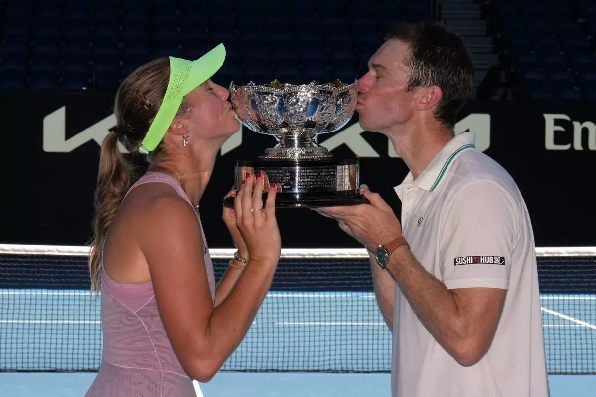 Australia's Olivia Gadecki and John Peers kiss their trophy after defeating France's Kristina Mladenovic and Manuel Guinard in the mixed doubles final at the Australian Open tennis championship in Melbourne, Australia, Friday, Jan. 30, 2026. (AP Photo/Dita Alangkara)