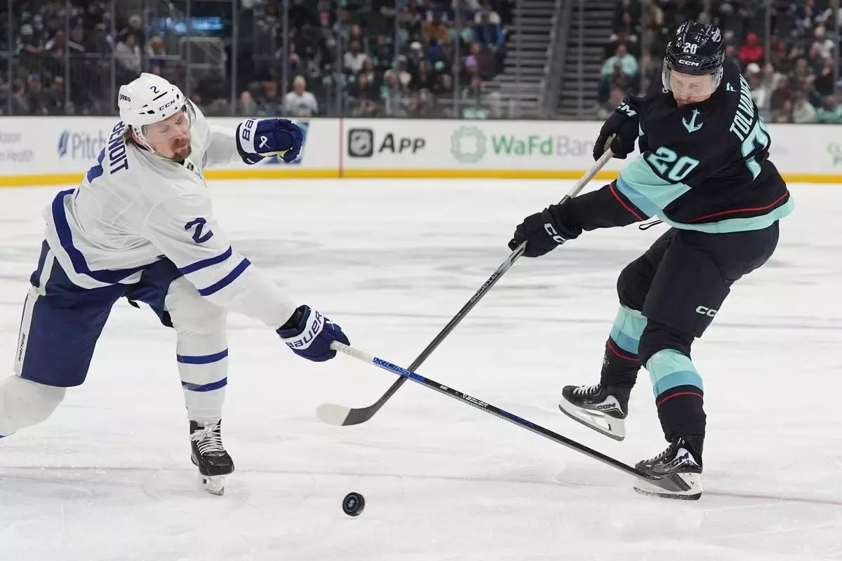 Toronto Maple Leafs defenseman Simon Benoit (2) tries to block a shot from Seattle Kraken right wing Eeli Tolvanen (20) during the third period of an NHL hockey game Thursday, Jan. 29, 2026, in Seattle. (AP Photo/Lindsey Wasson)
