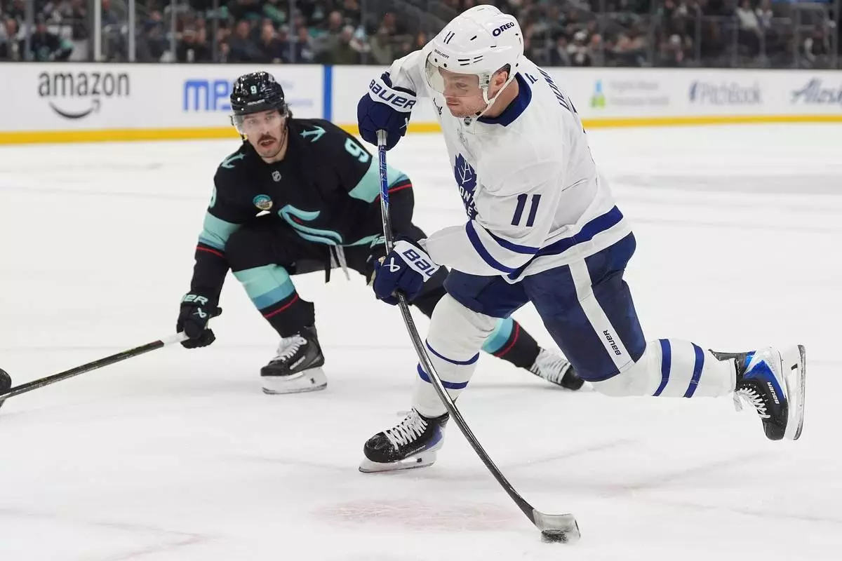 Toronto Maple Leafs center Max Domi (11) shoots as Seattle Kraken center Chandler Stephenson (9) looks on during the second period of an NHL hockey game Thursday, Jan. 29, 2026, in Seattle. (AP Photo/Lindsey Wasson)