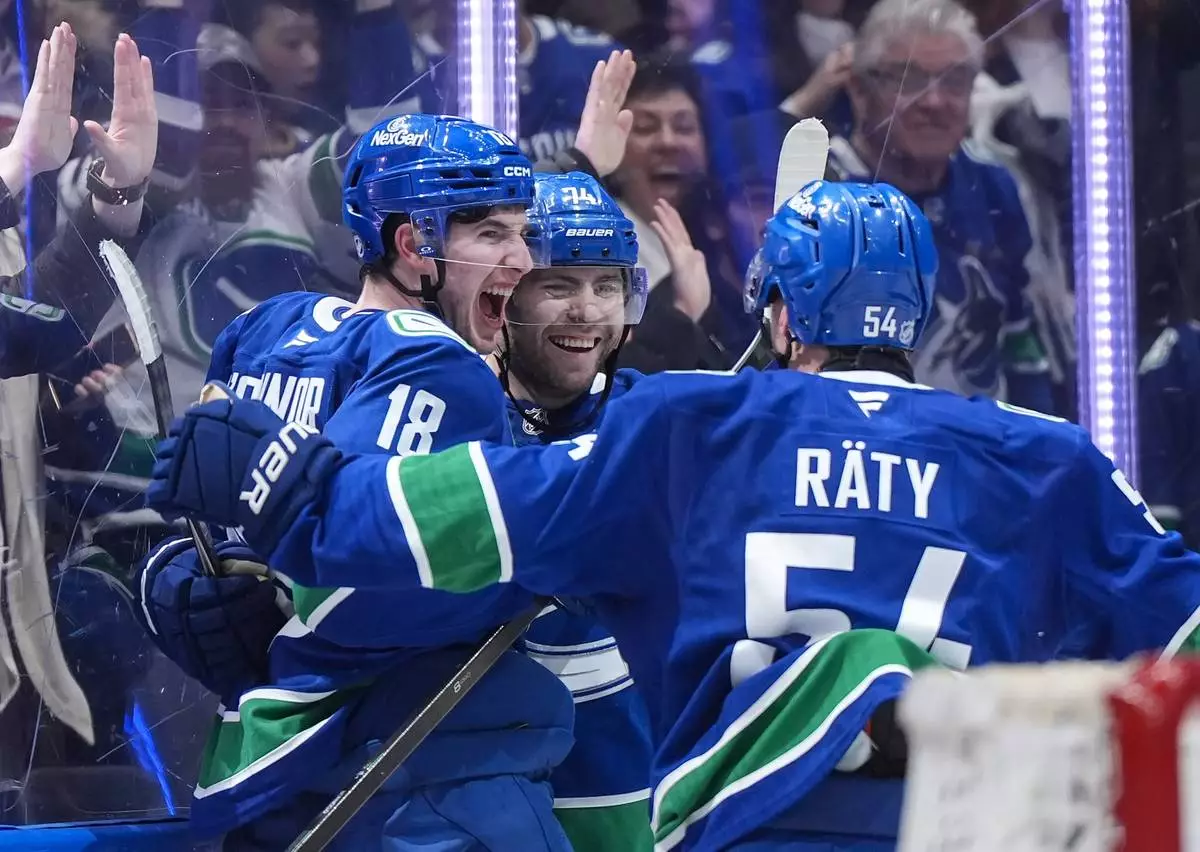 Vancouver Canucks' Drew O'Connor (18), Jake DeBrusk (74) and Aatu Raty (54) celebrate O'Connor's goal against the Anaheim Ducks during the third period of an NHL hockey game, in Vancouver, British Columbia, Thursday, Jan. 29, 2026. (Darryl Dyck/The Canadian Press via AP)