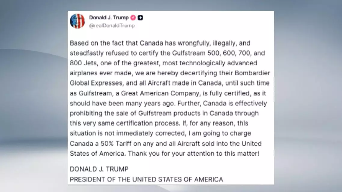 "We are hereby decertifying their Bombardier Global Expresses, and all Aircraft made in Canada, until such time as Gulfstream, a Great American Company, is fully certified," Trump said in a social media post Thursday.