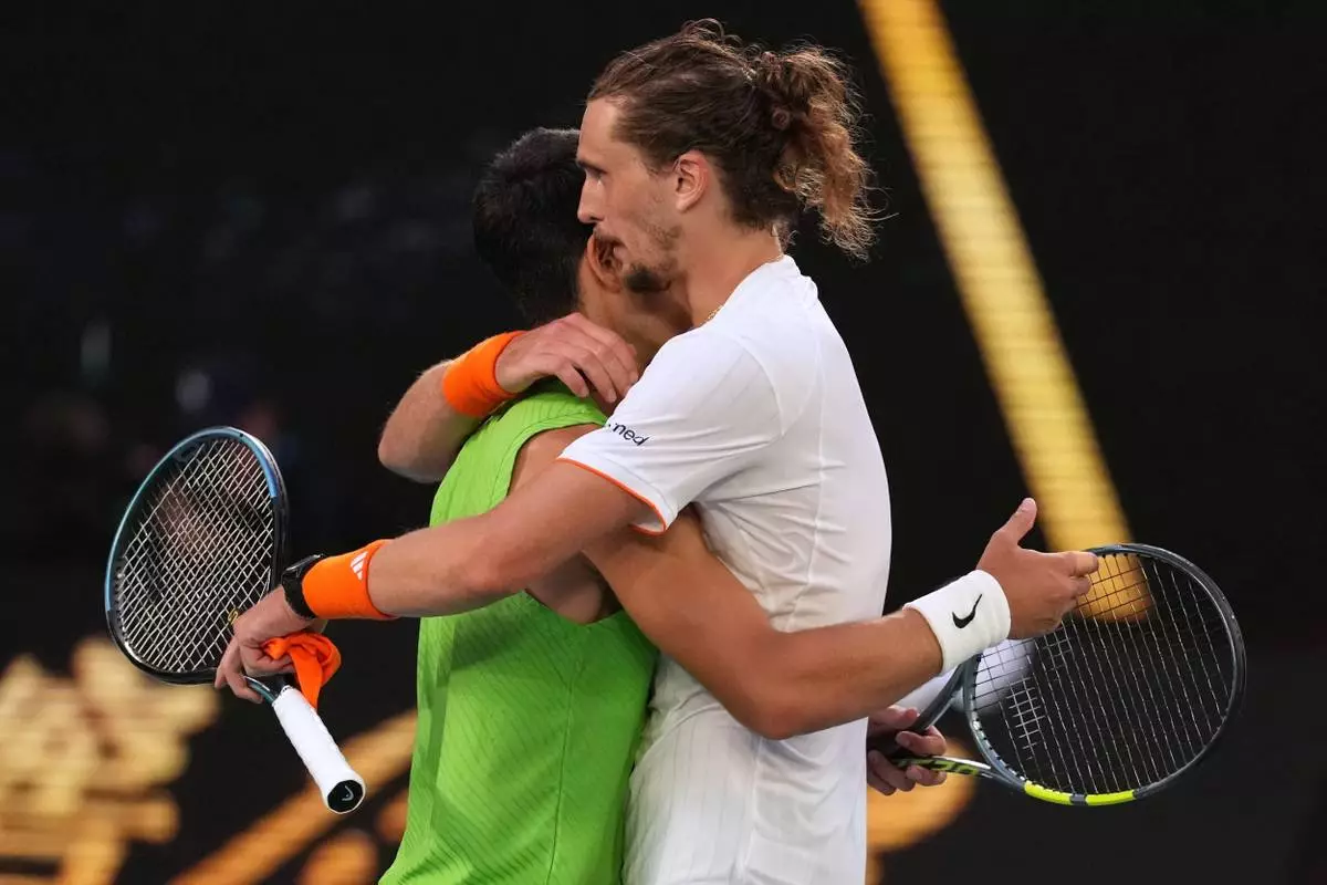 Carlos Alcaraz of Spain is congratulated by Alexander Zverev, right, of Germany following their semifinal match at the Australian Open tennis championship in Melbourne, Australia, Friday, Jan. 30, 2026. (AP Photo/Dita Alangakra)