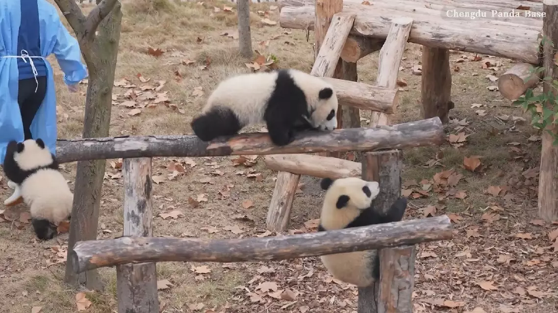 Giant panda cubs at Chengdu base begin outdoor adventures, train climbing skills