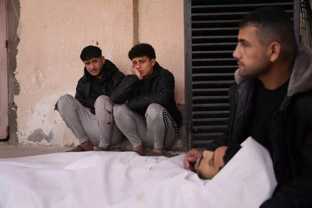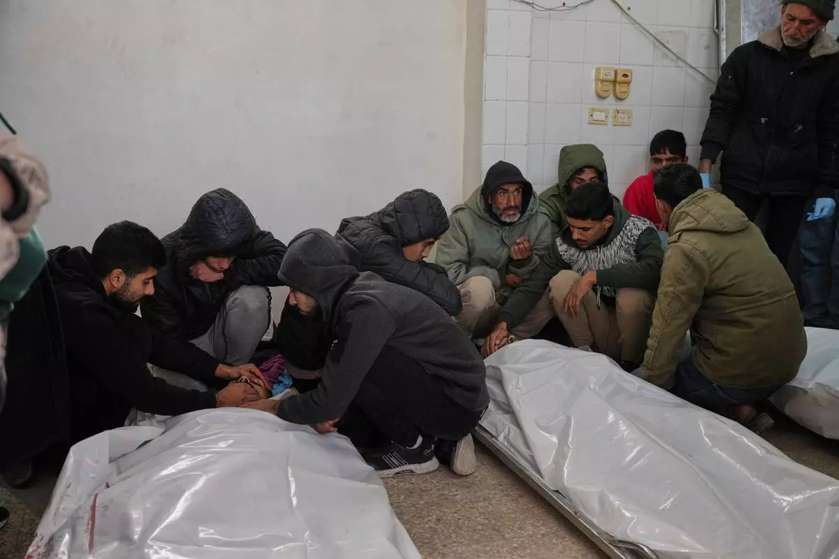 Palestinians mourn over the bodies of people who were killed in an Israeli strike, before their funeral at Al-Aqsa Hospital in Deir al-Balah, central Gaza Strip, Friday, Jan. 30, 2026. (AP Photo/Abdel Kareem Hana)