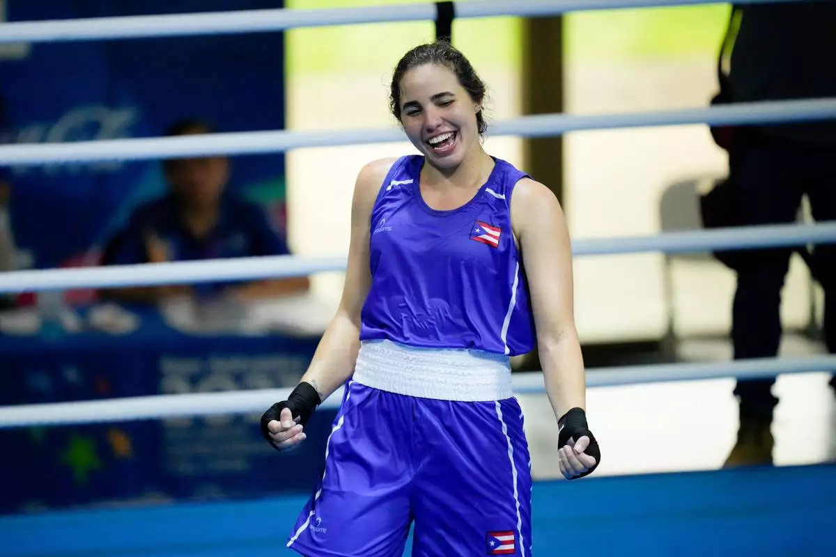 FILE - Puerto Rico's Stephanie Pineiro Aquino celebrates after defeating the Dominican Republic's Maria Moronta, during the women's 66kg boxing final of the Central American and Caribbean Games in San Salvador, El Salvador, Wednesday, June 28, 2023. (AP Photo/Arnulfo Franco, File)