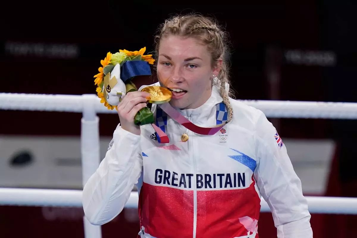 FILE - Gold medal winner Britain's Lauren Price during their women's middleweight 75-kg boxing medal ceremony at the 2020 Summer Olympics, Sunday, Aug. 8, 2021, in Tokyo, Japan. (AP Photo/Frank Franklin II, File)