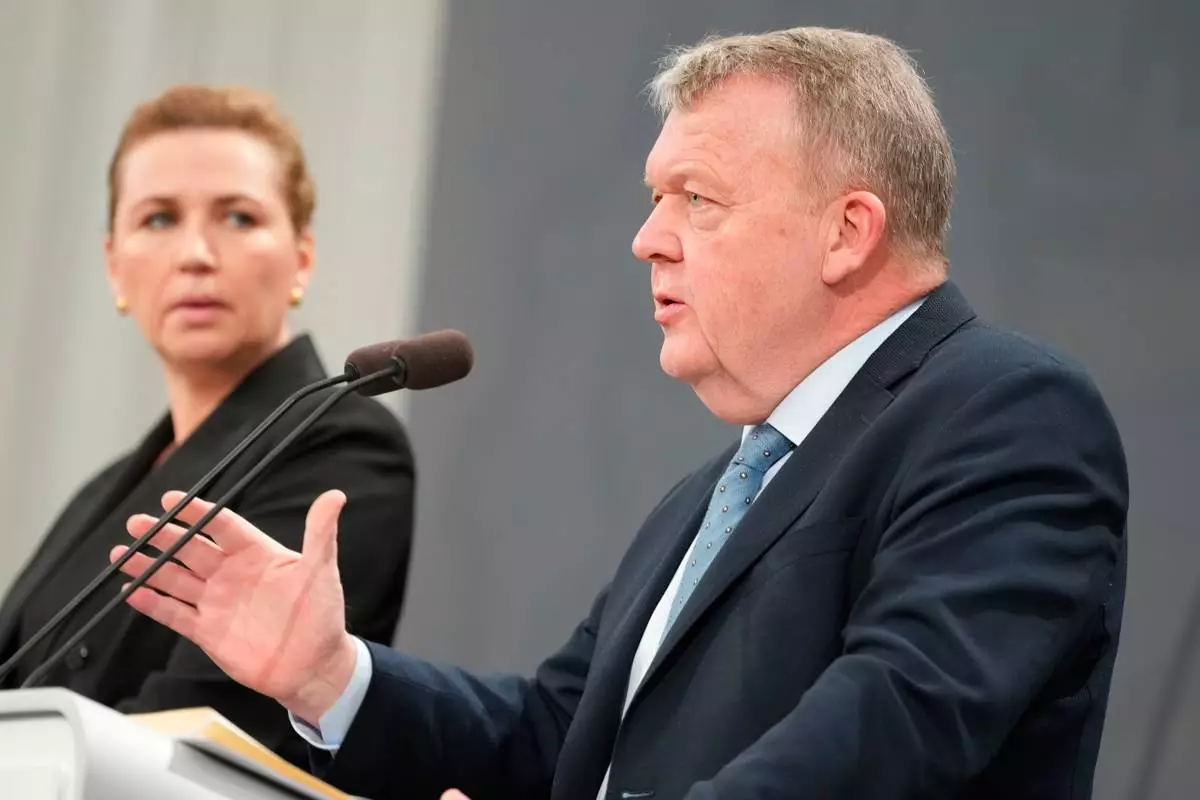 Denmark's Minister of Foreign Affairs Lars Loekke Rasmussen, right, and Denmark's Prime Minister Mette Frederiksen present the government's new deportation reform at a press conference in Copenhagen, Friday, Jan. 30, 2026. (Liselotte Sabroe/Ritzau Scanpix via AP)