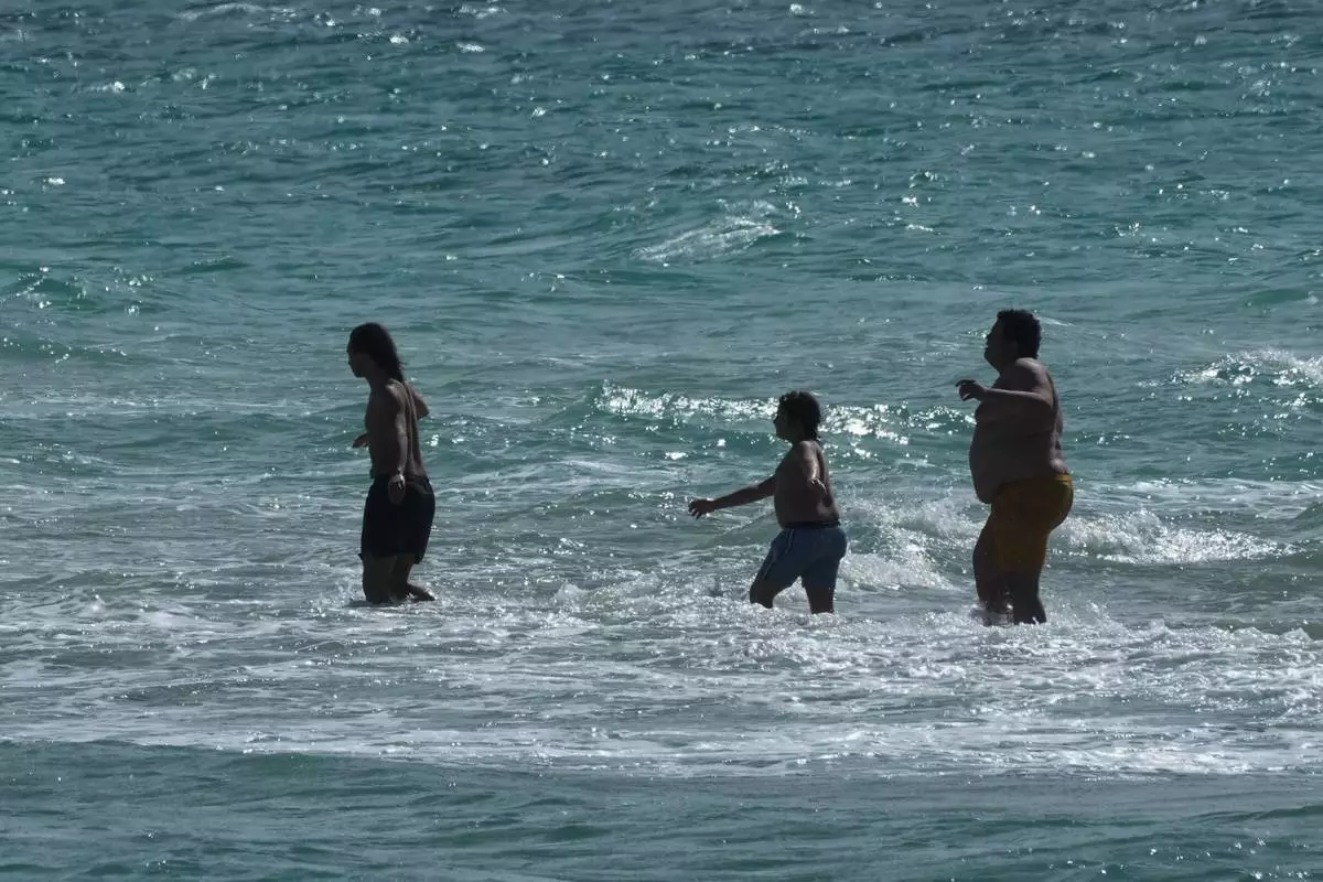 Beachgoers brave the cold ocean temperature while walking on a sandbar Thursday, Jan. 29, 2026, in Miami Beach, Fla. (AP Photo/Marta Lavandier)