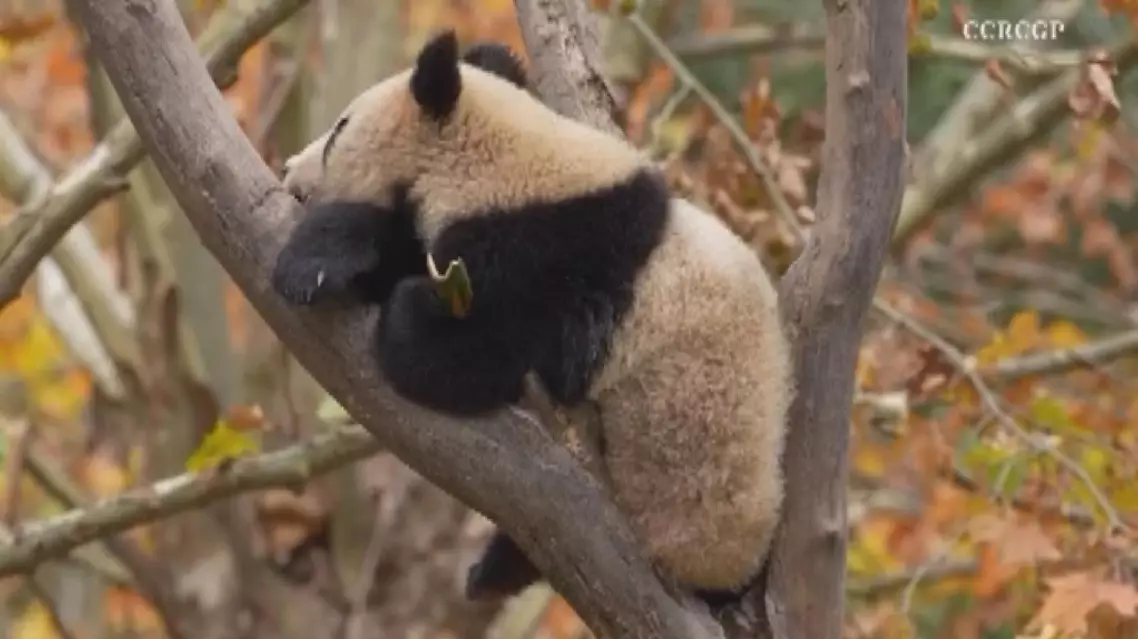 A giant panda cub has been captured on video adorably clutching its prized bamboo shoot while perched on a tree branch for a nap at the Wolong Shenshuping base in southwest China.