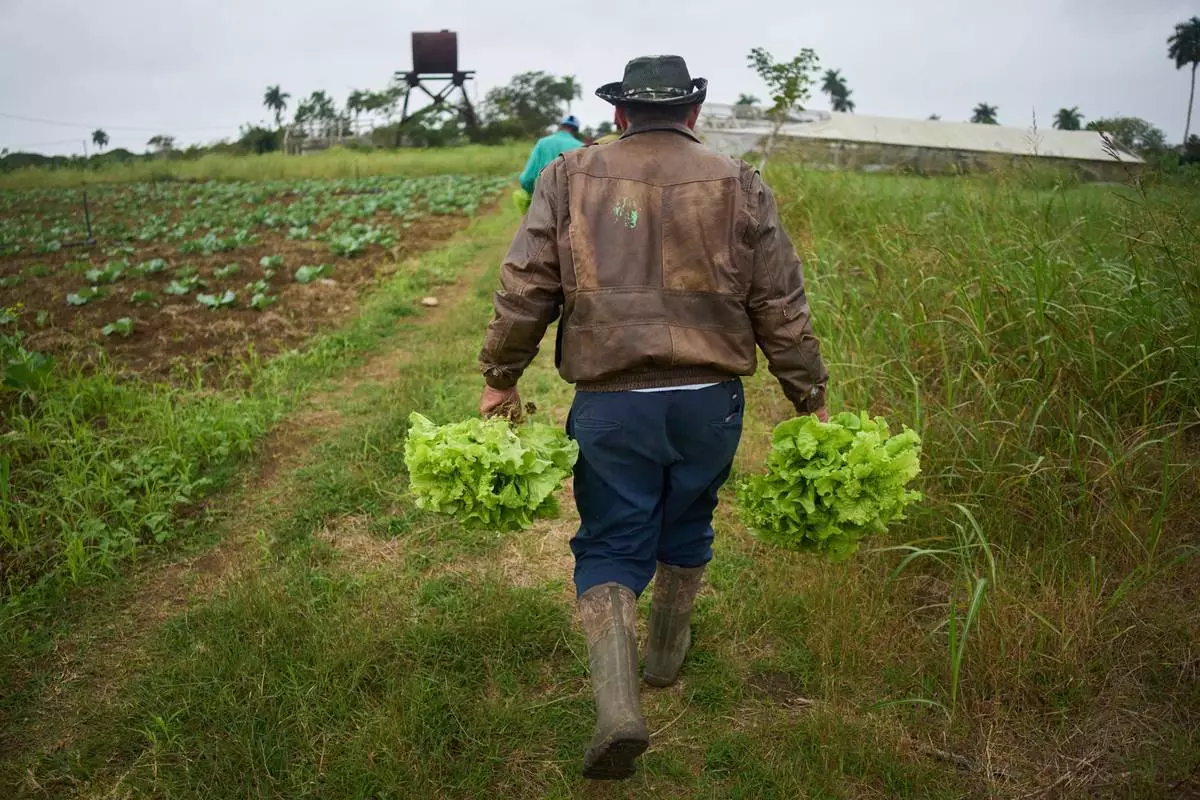 Farmer Lazaro Sanches harvests lettuce on his land in Minas, Havana province, Cuba, Wednesday, Jan. 28, 2026. (AP Photo/Ramon Espinosa)