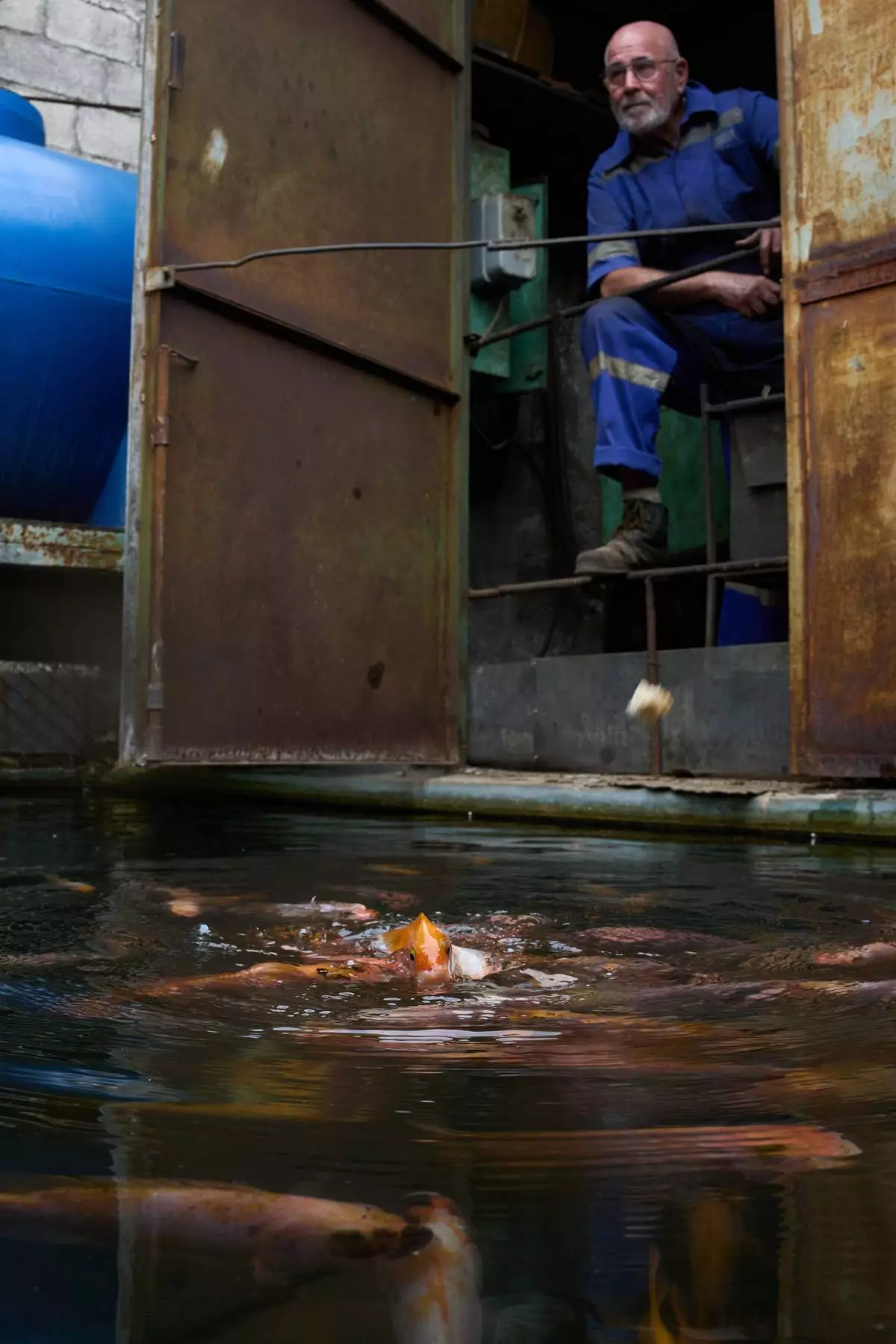 A worker on Felix Jose Morfi's property watches over a tank of fish being raised for self-consumption in Regla, Havana province, Cuba, Thursday, Jan. 29, 2026. (AP Photo/Ramon Espinosa)