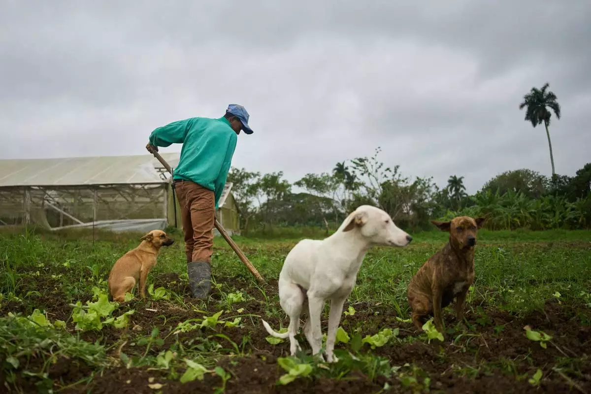 A farm worker tills the land to plant lettuce, alongside his dogs on the land of Lazaro Sanches in Minas, Havana province, Cuba, Wednesday, Jan. 28, 2026. (AP Photo/Ramon Espinosa)