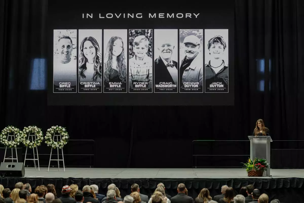 FILE - Jordyn Biffle, sister of Greg Biffle, speaks at the memorial service for Biffle and his family in Charlotte, N.C., Jan. 16, 2026. (AP Photo/Nell Redmond, File)