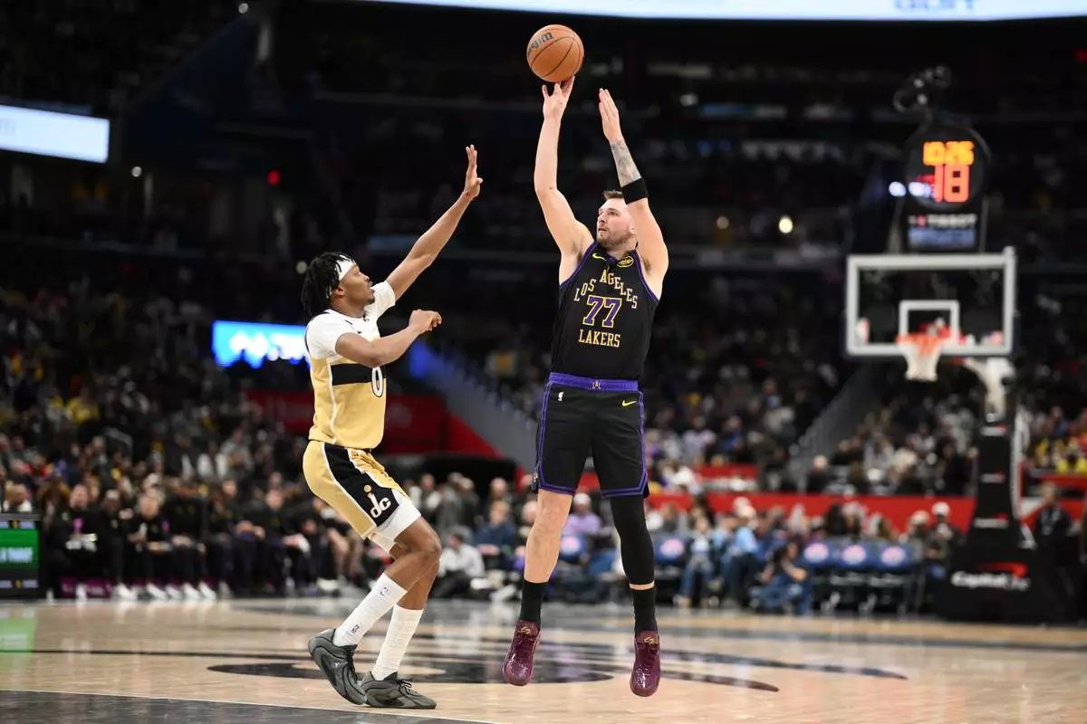 Los Angeles Lakers guard Luka Doncic (77) shoots against Washington Wizards guard Bilal Coulibaly (0) during the second half of an NBA basketball game, Friday, Jan. 30, 2026, in Washington. (AP Photo/Nick Wass)