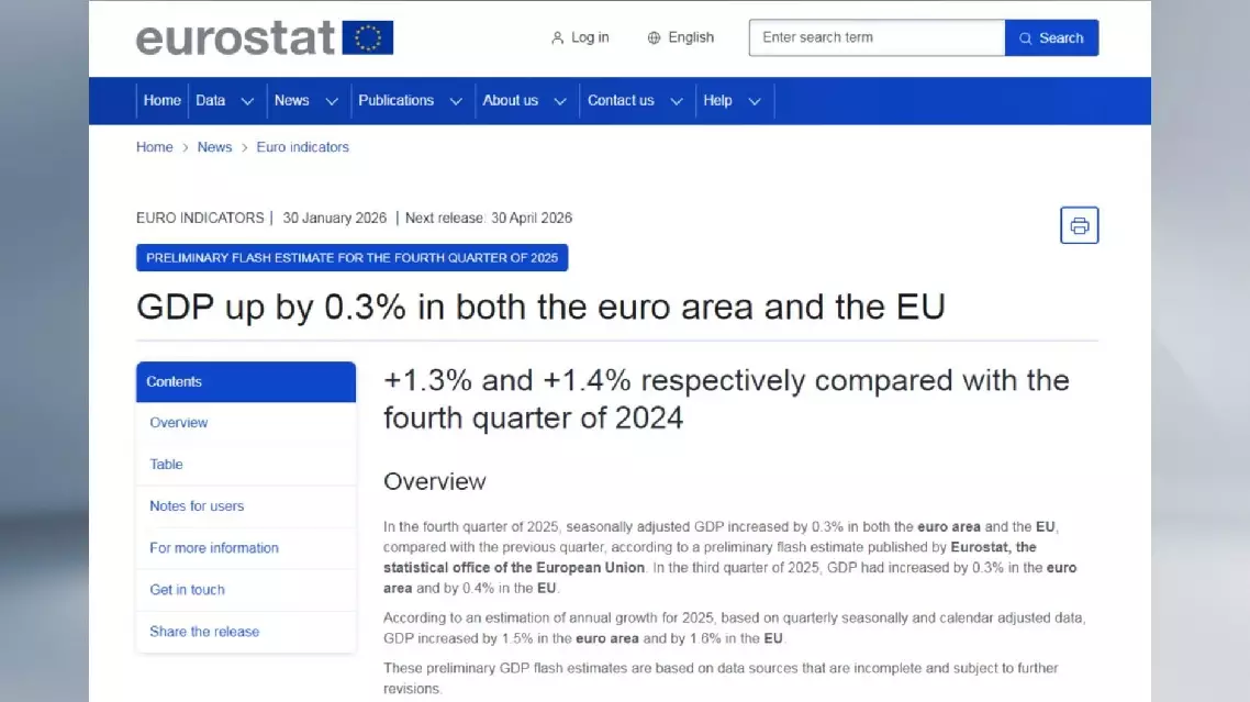 The figures are based on quarterly seasonally and calendar-adjusted data. Growth momentum moderated toward the end of the year, with seasonally adjusted GDP in both the euro area and the EU rising 0.3 percent quarter-on-quarter in the fourth quarter of 2025.