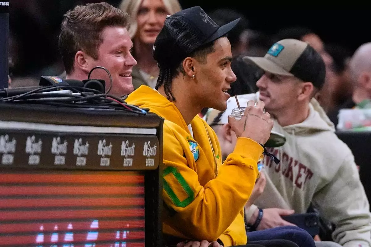 New England Patriots cornerback Christian Gonzalez, center, sits courtside during the second half of an NBA basketball game between the Boston Celtics and the Sacramento Kings, Friday, Jan. 30, 2026, in Boston. (AP Photo/Charles Krupa)