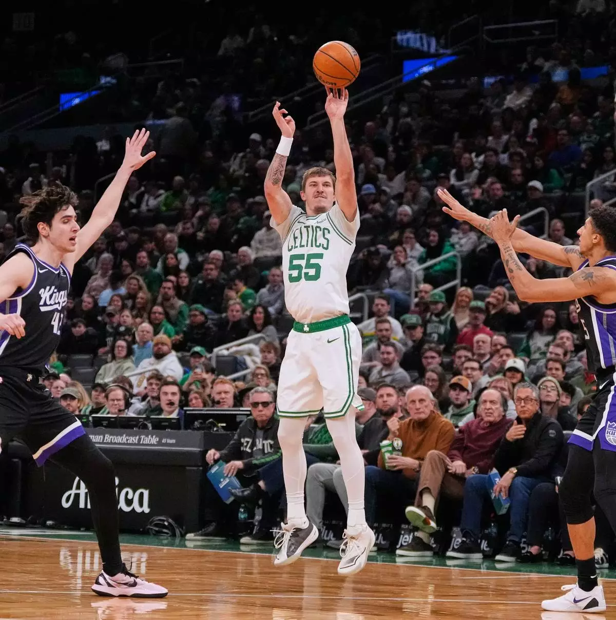 Boston Celtics guard Baylor Scheierman (55) takes a shot against the Sacramento Kings during the first half of an NBA basketball game, Friday, Jan. 30, 2026, in Boston. (AP Photo/Charles Krupa)