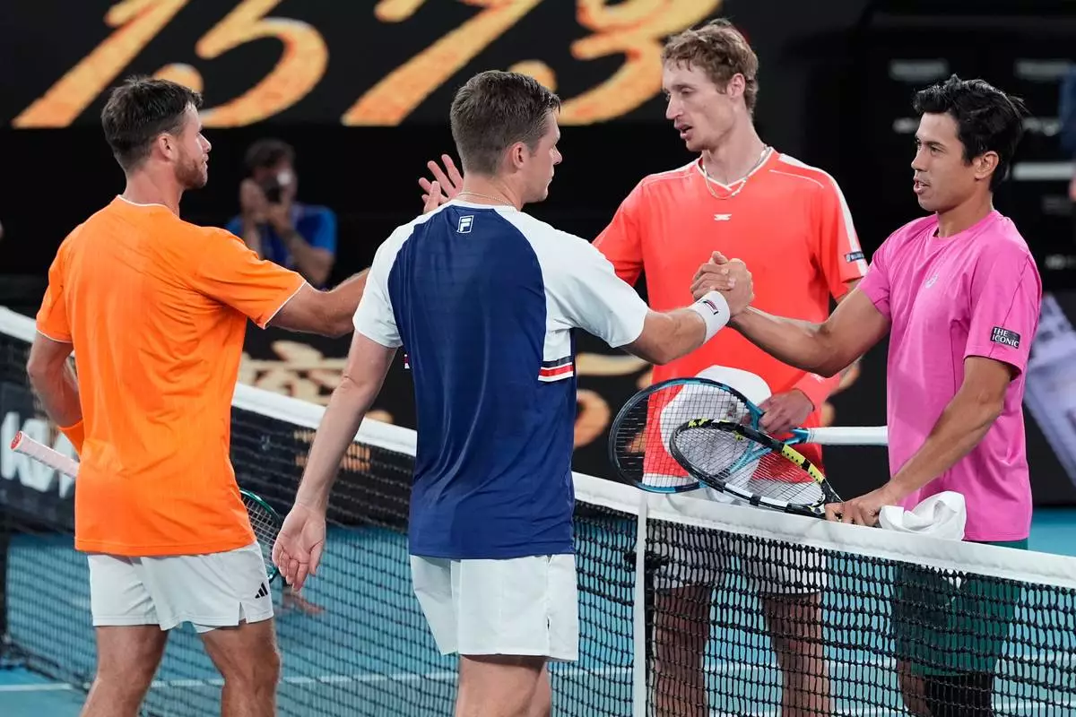 Christian Harrison, left, of the U.S. and Neal Skupski of Britain are congratulated by Australia's Jason Kubler, right, and Marc Polmans after winning the men's doubles final at the Australian Open tennis championship in Melbourne, Australia, Saturday, Jan. 31, 2026. (AP Photo/Asanka Brendon Ratnayake)