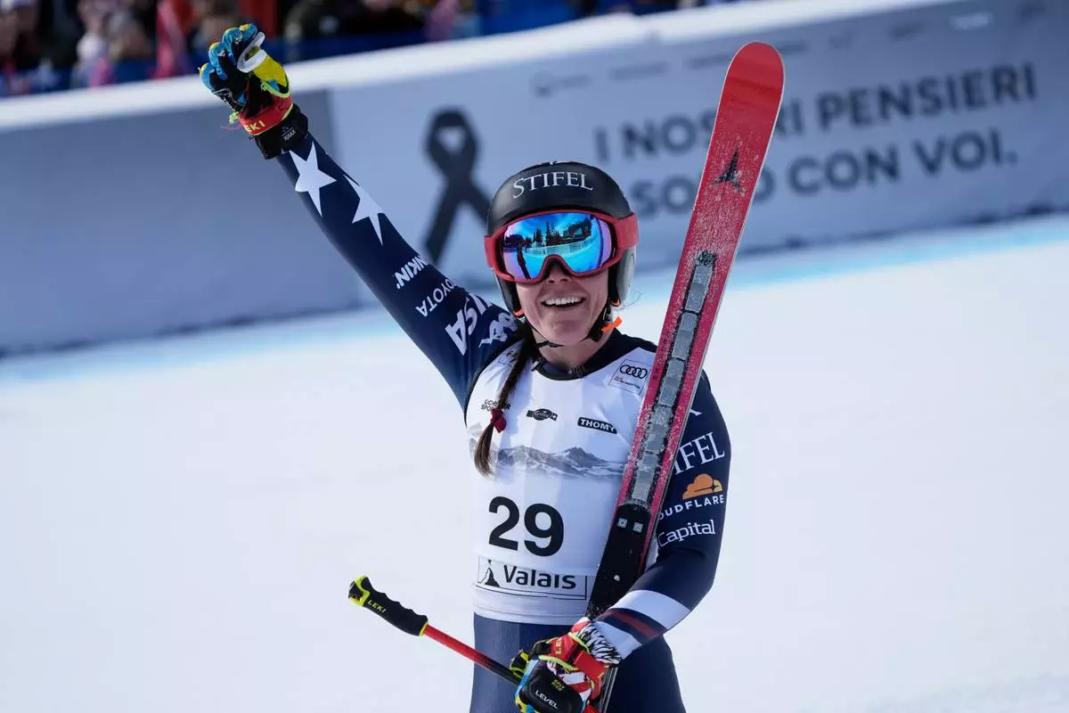 United States' Breezy Johnson celebrates at the finish area of an alpine ski, women's World Cup Super G, in Crans Montana, Switzerland, Saturday, Jan. 31, 2026. (AP Photo/Giovanni Auletta)