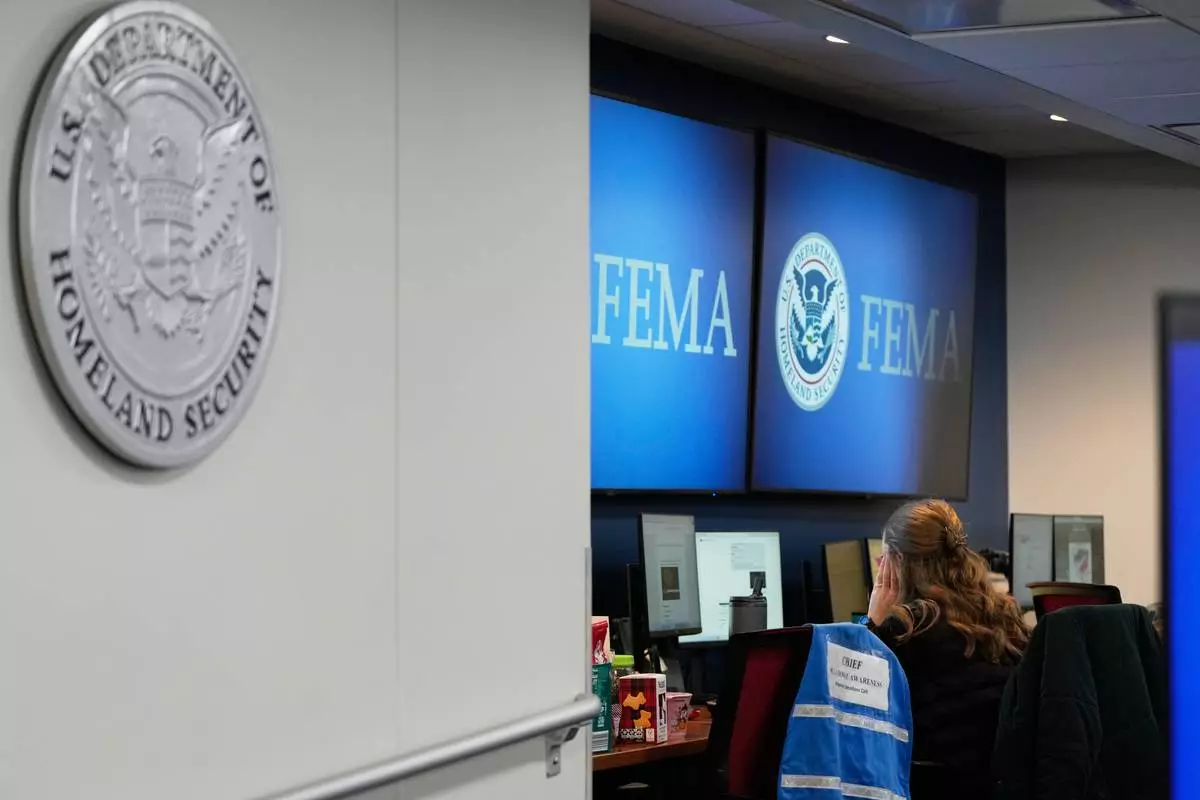 A person works at Federal Emergency Management Agency headquarters Saturday, Jan. 24, 2026, in Washington. (AP Photo/Julia Demaree Nikhinson)