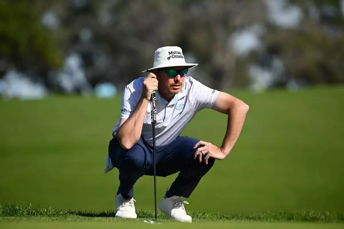 Joel Dahmen lines up his putt on the second green of the South Course at Torrey Pines during the third round of the Farmers Insurance Open golf tournament Saturday, Jan. 31, 2026, in San Diego. (AP Photo/Denis Poroy)