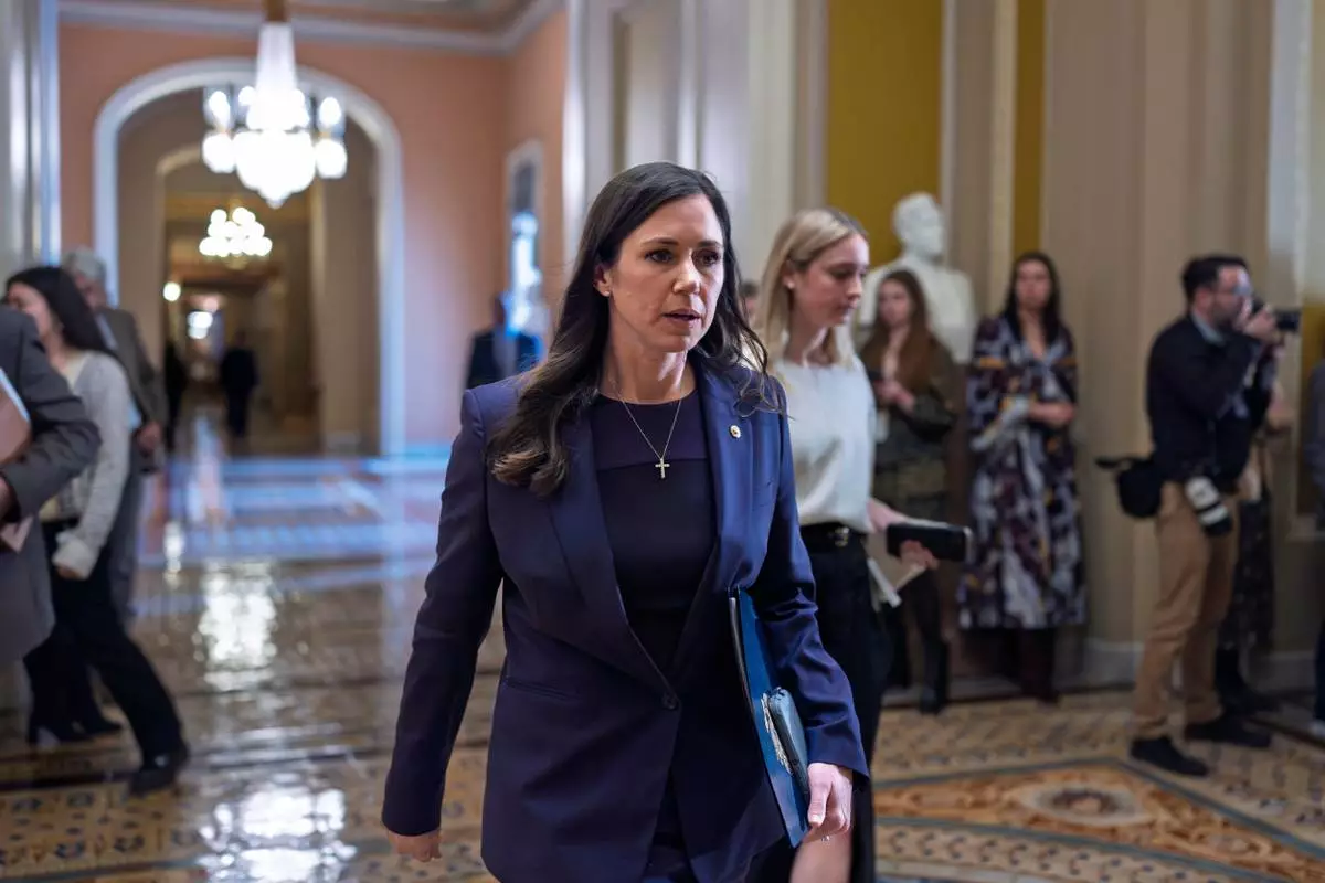 Sen. Katie Britt, R-Ala., who chairs the Department of Homeland Security Appropriations Subcommittee, walks to the chamber following a closed-door meeting with fellow Republicans on spending legislation, at the Capitol in Washington, Wednesday, Jan. 28, 2026. (AP Photo/J. Scott Applewhite)