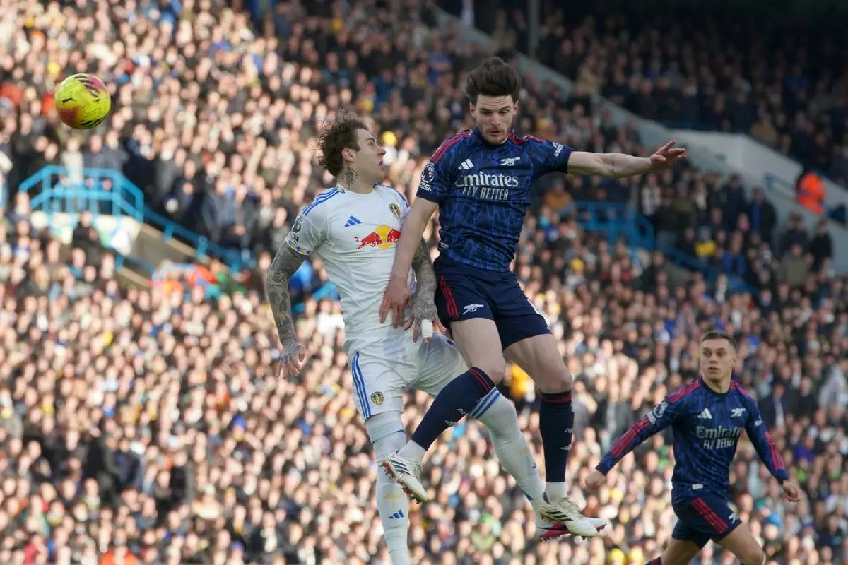 Leeds' Joe Rodon, left, and Arsenal's Declan Rice challenge for the ball during the English Premier League soccer match between Leeds United and Arsenal in Leeds, England, Saturday, Jan. 31, 2026. (AP Photo/Ian Hodgson)