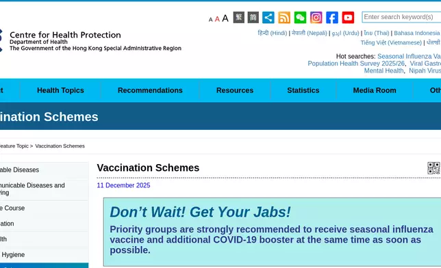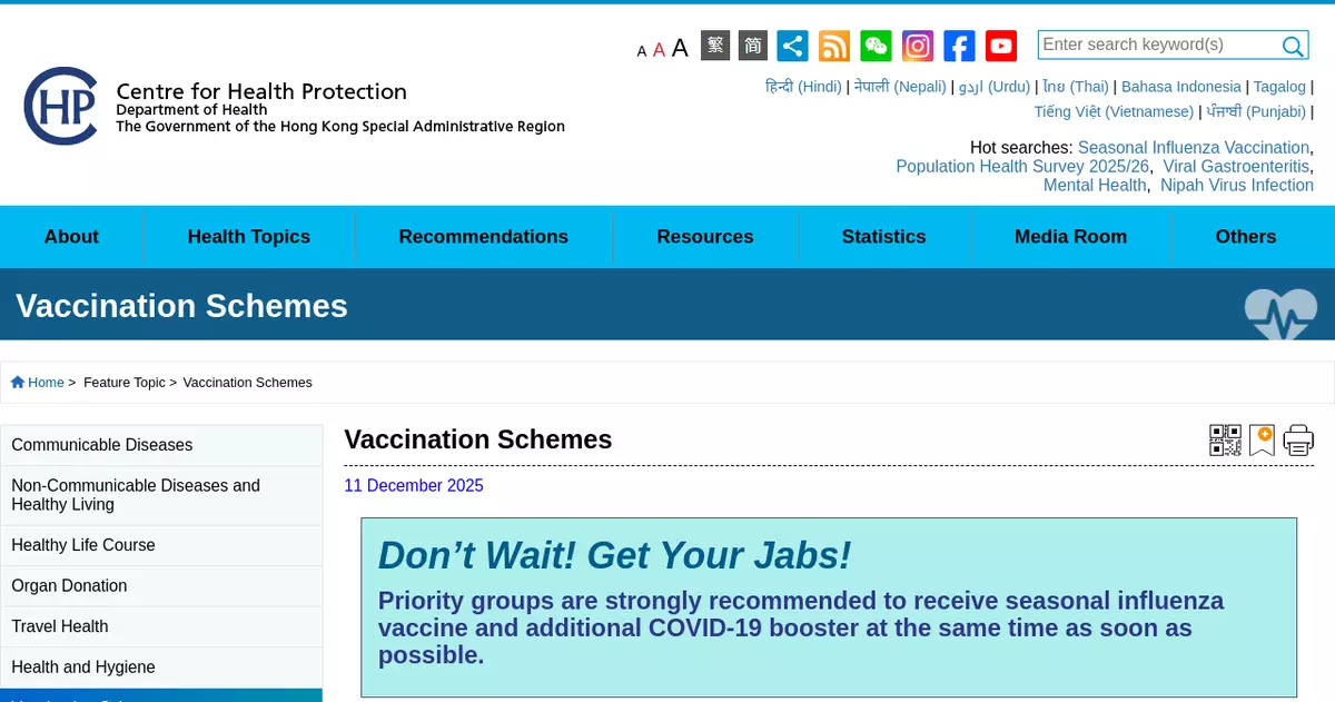 In addition, many respiratory pathogens, including influenza and SARS-CoV-2, may have increasing activity and community transmission during winter. Seasonal influenza vaccination is recommended for all persons aged 6 months or above, except those with known contraindications. Persons at higher risk of getting influenza and its complications, including the elderly and children, should receive seasonal influenza vaccinations early. Please see details of the vaccination schemes on theCHP'swebsite.