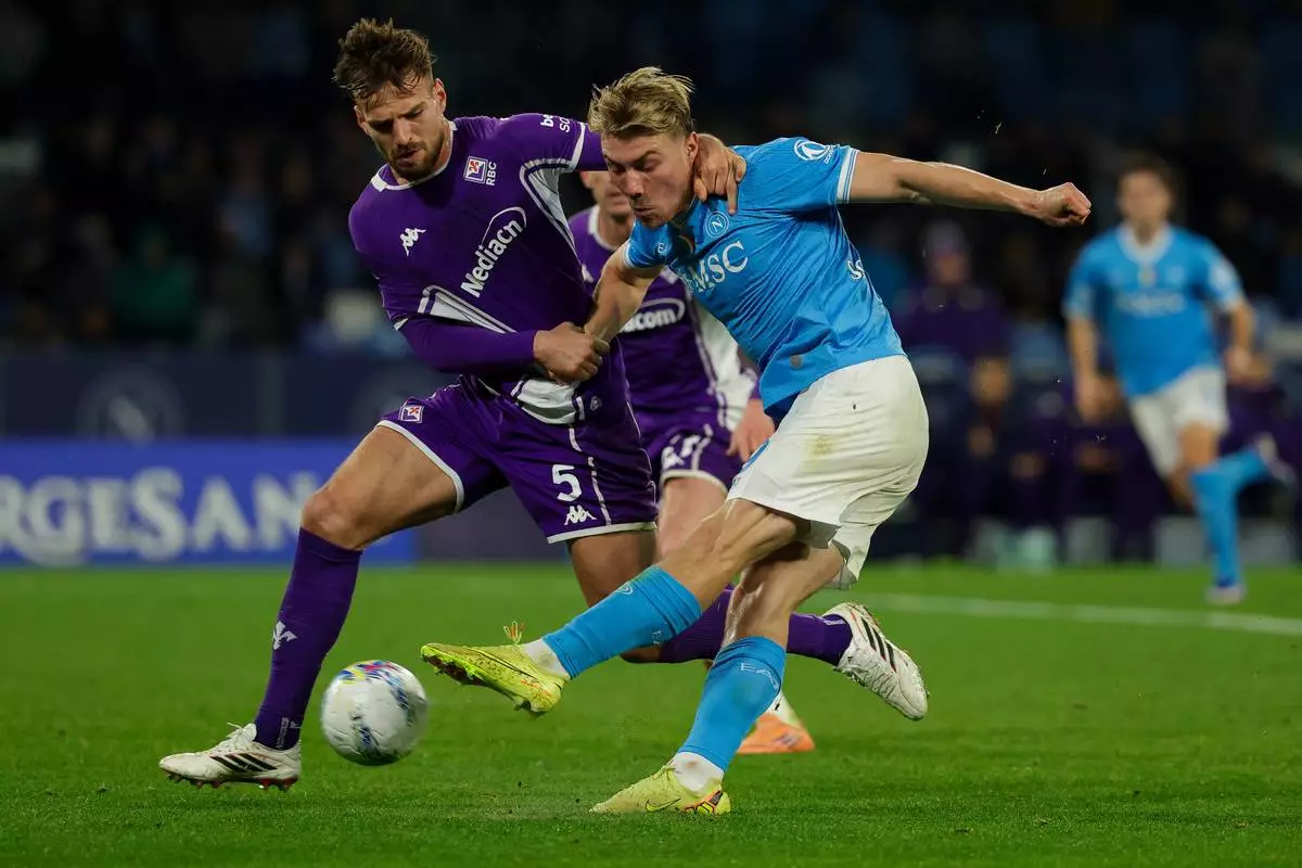 Vergara scored his first goal for Napoli in that defeat and he added to that with his first Serie A goal on Saturday, in the 11th minute. Rasmus Højlund was blocked from collecting a long ball by Fiorentina defenders but that allowed Vergara to latch onto it and sprint clear before drilling into the bottom right corner.