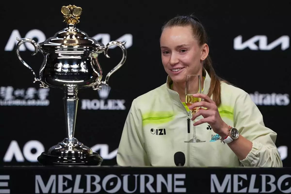 Elena Rybakina of Kazakhstan holds a glass of champagne as she sits next to the Daphne Akhurst Memorial Cup at a press conference after defeating Aryna Sabalenka of Belarus in the women's singles final at the Australian Open tennis championship in Melbourne, Australia, Saturday, Jan. 31, 2026. (AP Photo/Aaron Favila)